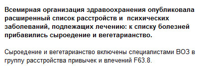 Впрочем, взрослые люди-то имеют право сходить с ума по-своему - это их личные проблемы. Однако когда родители-вегетарианцы или, не дай бог, сыроеды, своих малолетних детей принудительно сажают на такое питание - вот за это, как мне кажется, их самых нужно сажать. Потому что дети-то в чем виноваты?!!