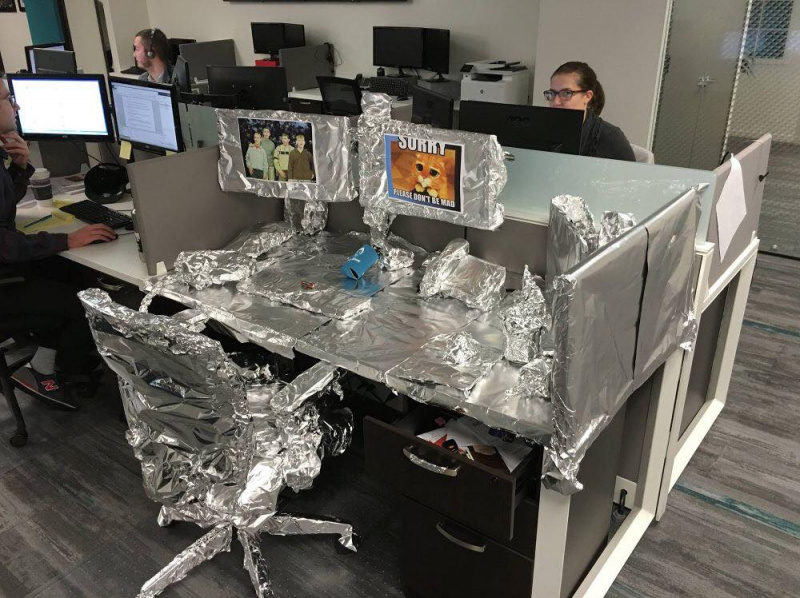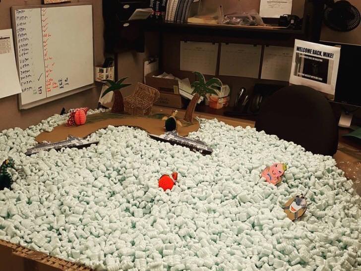 Слушайте, я за всю жизнь менее полугода проработал в помещении, где сидит пара десятков других сотрудников. Кто много в таких условиях работал: действительно существует традиция всячески разукрашивать рабочее место сотрудника к его выходу из отпуска? А то я смотрю - люди проявляют большую фантазию.