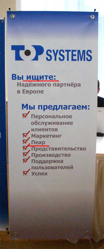 Впрочем, всякие отчеты и фотографии - в Softkey.info, а здесь я делаю запись по другому поводу. В прошлом году зарубежные друзья радовали нас своими умопомрачительными буклетами. В этом году с буклетами они порядок навели - видать, все-таки нашли кого-то из русскоговорящих для консультаций, - но одним плакатом все-таки порадовали. Ошибки не такие явные, но зато весьма пикантные: