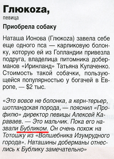 Я так думаю, что кот Бублик теперь просто обязан срубить немеряно денег с этой Глюкозы. Уж если какой-то вшивый Ричард Дирлов срубил с Комбса 200 штук за использование своего псевдонима, то всемирно известный кот Бублик, который испытал неслыханные моральные страдания оттого, что какая-то вшивая Глюкоза назвала его великим именем своего вшивого болона (да хоть и керн-терьера, без разницы), - вот за это он должен отсудить гигантскую сумму. На которую мы закупим провианта, способного залечить жуткую психологическую травму.