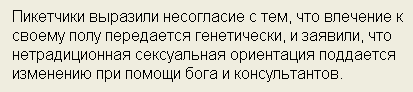 Сначала я прочитал окончание фразы как "при помощи блога и консультантов". Подумал еще, что зря они не указали адрес этого блога. Потом выяснилось, что ориентация поддается изменению при помощи Бога. И каких-то консультантов Бога. Это очень интересная и свежая мысль. А "пикетчики выразили несогласие с тем, что влечение к своему полу передается генетически" - просто великолепно звучит.