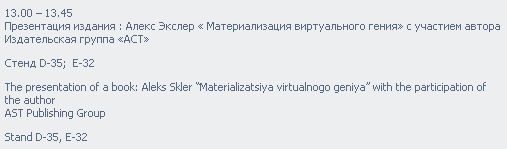 Буду там в субботу, примерно с 13 до 14 на стенде "АСТ" (57 павильон). Буду материализовать виртуального гения, если сумею его поймать. Передо мной, кстати, на этом же стенде будет Леня Каганов. Его я и материализую.