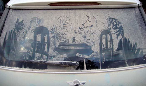 badula, как всегда, циничен, но совершенно прав, цитирую:По Рунету одно время долго гуляла фотография "Газели", на грязном боку которой была нарисована целая деревня. Говорили, правда, что это не рисунок, а наклейка. Безотносительно к, вот ссылка на сайт художника по имени Scott Wade, который действительно рисует на задних грязных стеклах автомашин. Вот галерея рисунков. Некоторые из них - просто блеск, полюбуйтесь на несколько примеров: