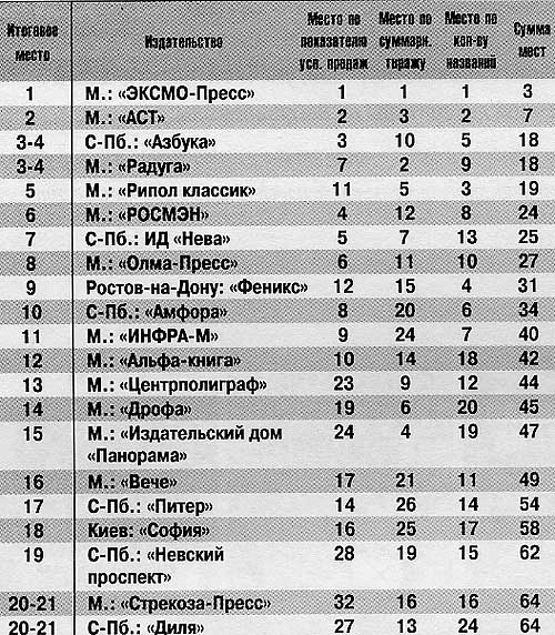 Нет, ну сегодня просто урожайный день на зажигательные статьи. Опять Лента. Правда, тут уже не Лента зажигает, а сам информационный повод: Московский футбольный клуб нанял колдуна. Футбольный клуб "Москва" нанял старикашку Эдельвейса. В клубе в его обязанности входит "осмысливание процессов и поиск возможностей, как строить правильную стратегию". Фотография колдуна тоже порадовала.Рейтинг российских издательств по версии журнала "Книжный бизнес":