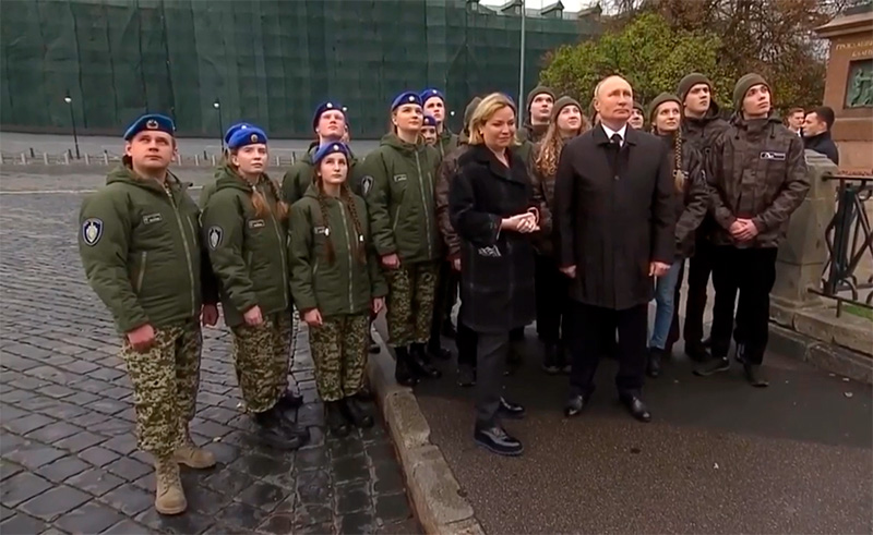 Президент России Владимир Путин вместе с министром культуры Ольгой Любимовой послушали обновленный звон курантов Спасской башни Кремля. Их запустили в День народного единства спустя почти месяц тишины. Свой первый бой обновленные куранты дали с опозданием — в 12:15 вместо 12:00. Ольга Любимова отметила, что такое произошло в первый и последний раз — в честь праздника. (Отсюда.)
