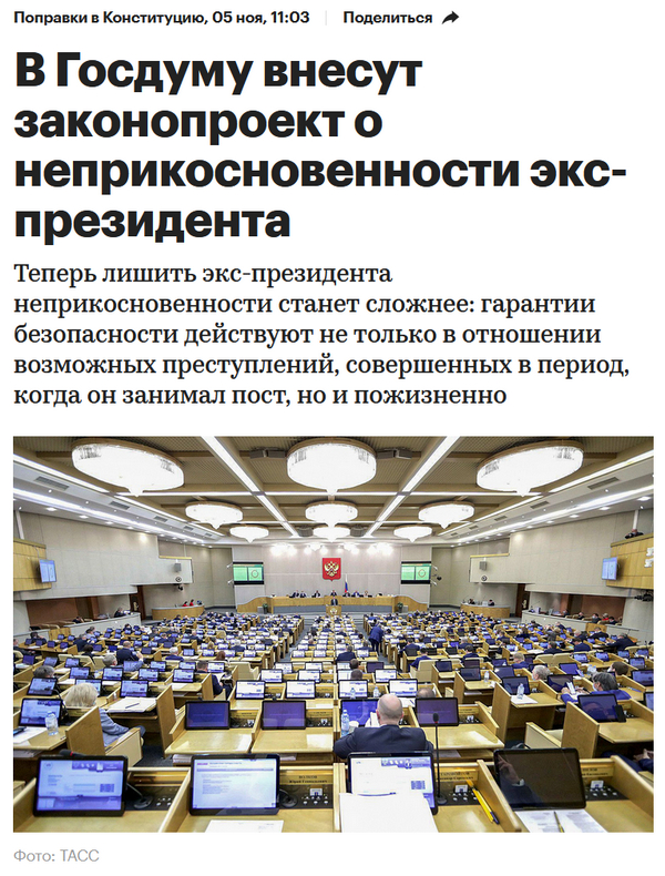 В субботу вечером (!) Путин вносит поправки, позволяющие экс-президенту, то есть ему (а кому же еще?) оставаться пожизненным сенатором