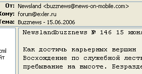 Носик вчера писал о трех номинациях национальной (ну, разумеется) премии в области медиа-менеджмента. Три кандидата - все как на подбор. За русскую ICQ (гы-гы), за "деловую газету "Взгляд"" (тут даже и не гыгыкнешь), и за крутейший новостной сервис Newsland. Я, в общем, на все эти премии и номинантов внимания обычно не обращаю, но тут сегодня разгребаю спамерский фолдер и вдруг с удивлением обнаруживаю спамерскую рассылку от того самого Newsland. Да-да, под заголовком "Buzznews - 15.06.2006" на несколько моих ящиков, в том числе технических. Например, на forum@exler.ru.