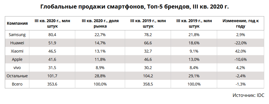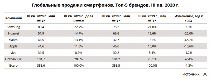 Ключевые данные исследования IDC также подтверждаются цифрами аналитиков из Counterpoint Technology Market Research, также опубликовавшими сегодня свой отчет. По их данным, глобальный рынок смартфонов по итогам III квартала 2020 г. составил 366 млн штук, что на 4% меньше чем годом ранее, однако сразу на 32% больше чем за предыдущий квартал. Пятерка лидеров рынка по их данным выглядит аналогично – Samsung, Huawei, Xiaomi, Apple и vivo.