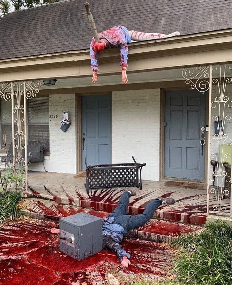 На нынешний Хэллоуин он изготовил несколько кукл в человеческий рост: одной размозжило голову сейфом, в спине другой застряла бензопила, третья оказалась в мусорном мешке, а четвертая осталась на крыше с пробитой головой. Всю эту инсталляцию он полил 75 литрами искусственной крови.