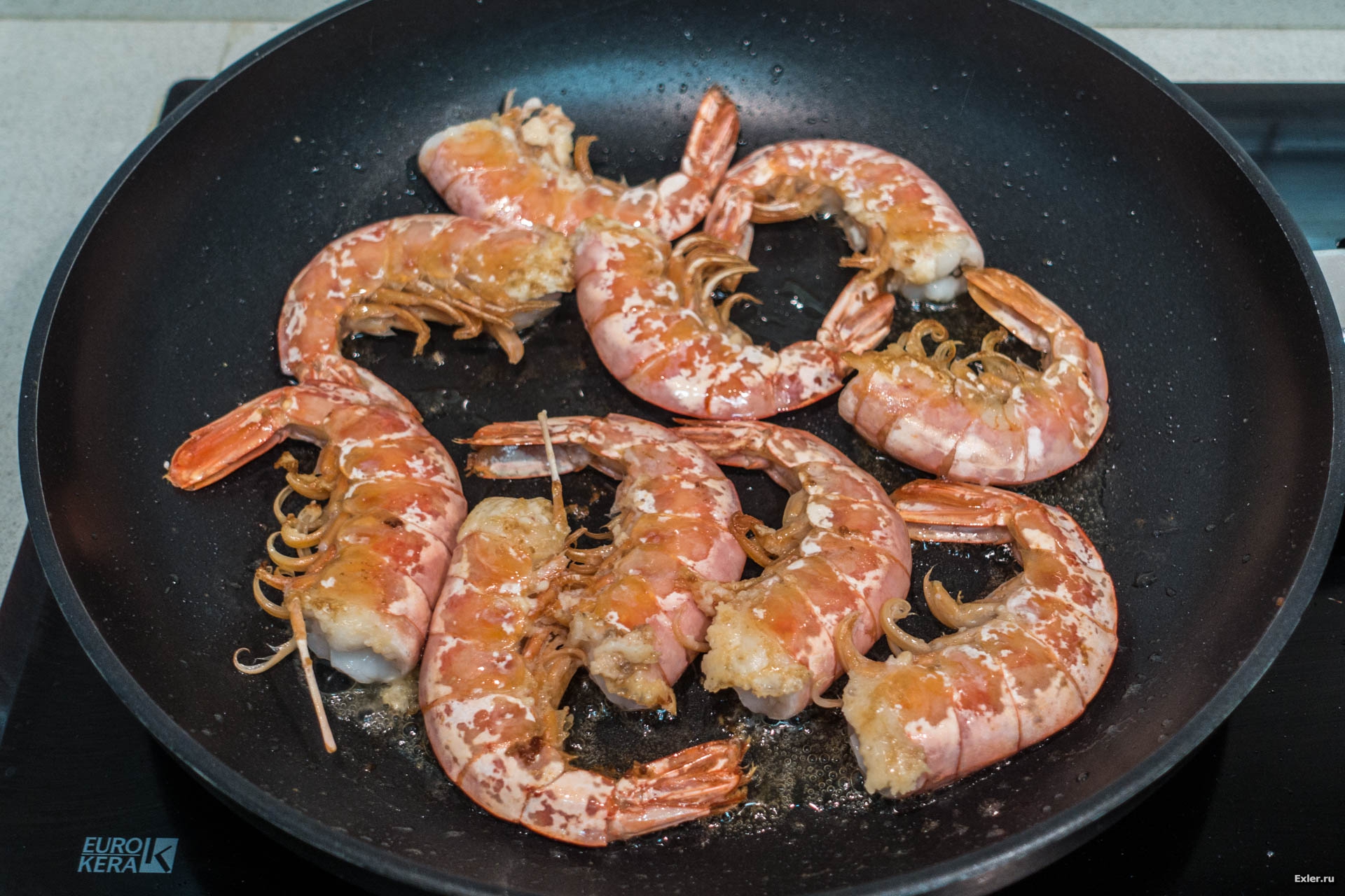Раскаляем сковородку, наливаем туда оливковое масло с чесноком. Выкладываем креветки так, чтобы каждая из них полностью прижималась к сковороде. Жарим на большом огне буквально пару минут на стороне (мясо креветки должно побелеть). Обязательно не больше пары минут на стороне: если пережарятся, то будут уже не такие вкусные и станут плохо чиститься.