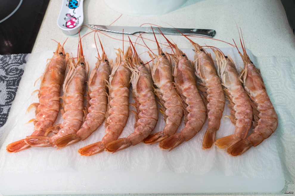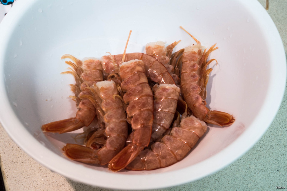 Берем несколько некрупных белорусских креветок. Размораживаем (можно в холодной воде - так разморозятся минут за 15). Промакиваем бумажным полотенцем - собрать воду.