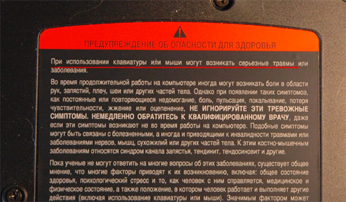 Снизу на клавиатуре Microsoft Natural содержится здоровенная наклейка с текстом. Заголовок - "Предупреждение об опасности для здоровья". Первая фраза, цитирую: При использовании клавиатуры или мыши могут возникать серьезные травмы или заболевания.