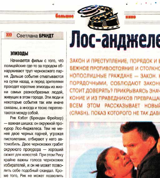 Израильская русскоязычная газета "Вести", приложение под названием "Нон-стоп". Рецензия некоей Светланы Брандт на фильм "Столкновение":