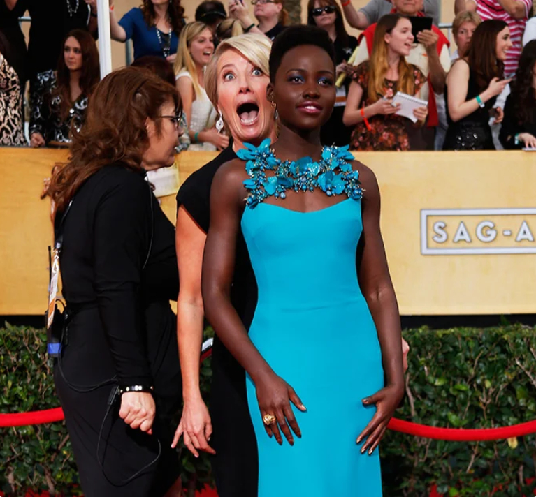 Эмма Томпсон подражает Скале на фоне Люпиты Нионго.