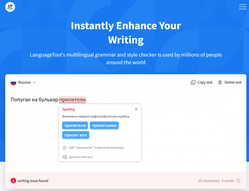 Работает с кучей языков, включая русский. У него есть платная версия, однако бесплатной версии хватает "за глаза", а кроме того, всякие расширенные словари в платной версии с русским не работают, а интеграция в Word и Google Docs, которая там предлагается, особо и не нужна, ведь в Word и Google Docs есть свои встроенные средства проверки.