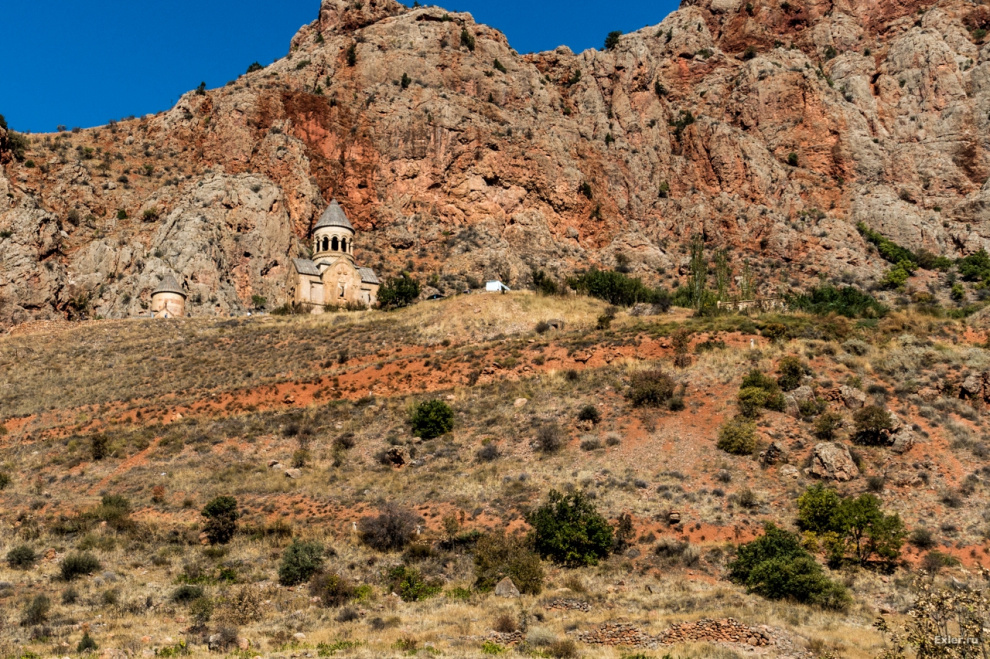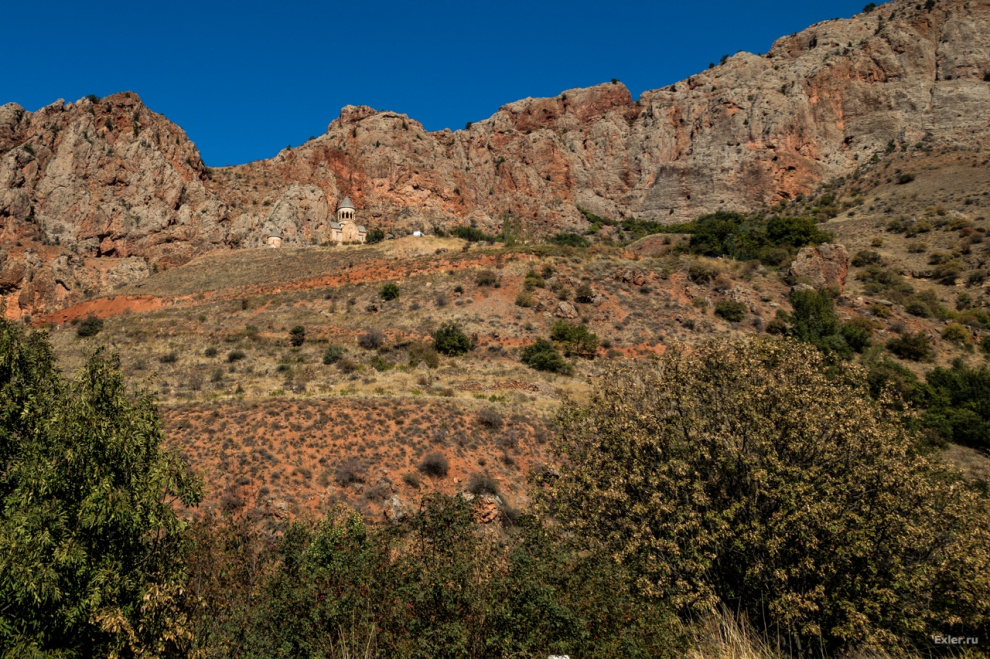 Монастырь Нораванк находится среди отвесных красных скал в глубоком и извилистом ущелье. Он был основан в ХII веке, стал крупным религиозным центром во времена правления князей Орбелянов, в ХIV веке монастырь был резиденцией епископов Сюника.