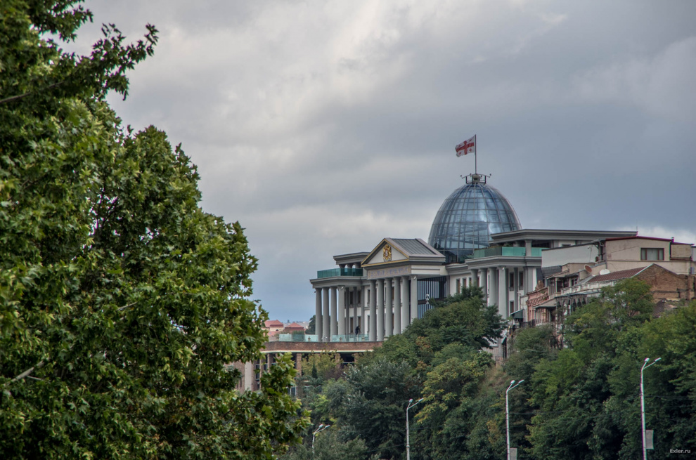 Кстати, о президентской резиденции. Она находится совсем недалеко от этого моста - вот это здание. Дизайн его также вызывает жаркие споры: дело в том, что Авлабарская резиденция похожа на странную смесь Белого дома с куполом Рейхстага.