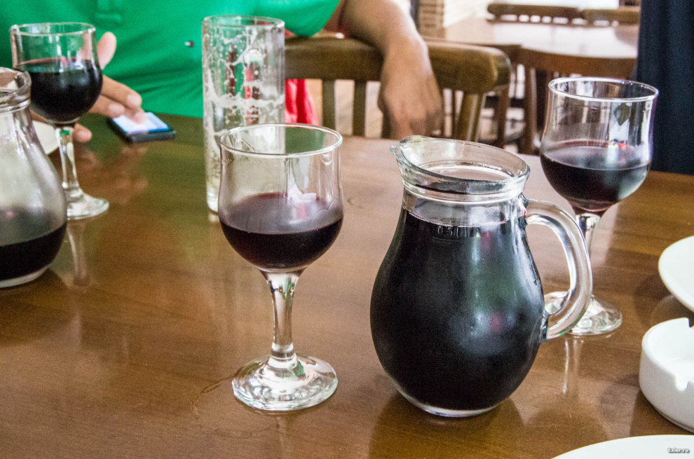Попробовали местного пива (пить можно, но ничего особенного), после чего заказали, как полагается, вина. Они тут подают домашнее Саперави - ну, допустим.