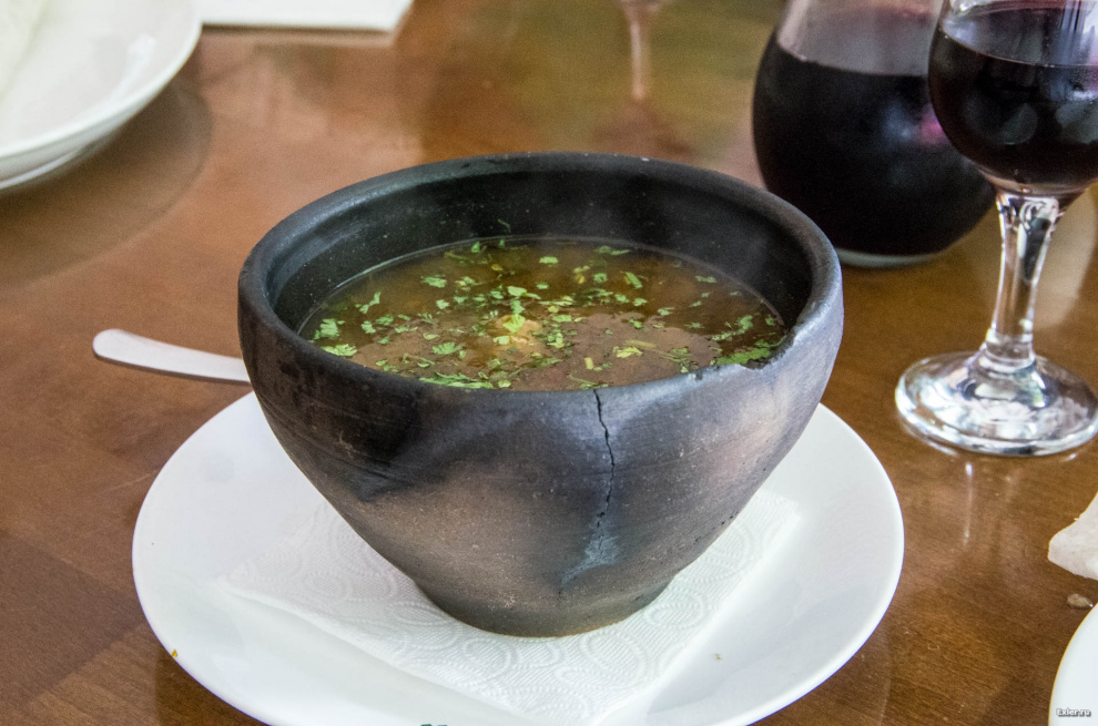 Я заказал обычный суп-харчо. (Тут есть еще мегрельский вариант, который делается с растертыми орехами - кстати, очень вкусно, я о таком блюде уже писал.) Супчик для харчо показался жидковатым, однако он был острый настолько, что просто дым из ушей. Вот не умеют они делать харчо, у меня в деревне харчо лучше делали - там аж ложка стояла!