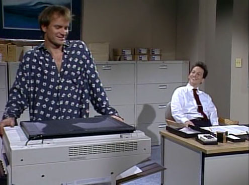 Вот один из лучших скетчей с Робом Шнайдером, где он изображает акына при ксероксе: что видит, о том и поет. Язык английский, но там, в общем, и без хорошего знания языка практически все понятно - скетч чисто звуковой. В конце у ксерокса появляется Стинг. Но Шнайдер и тут не теряется...