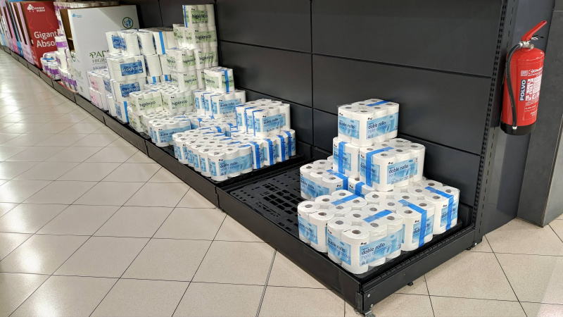 Туалетную бумагу - конкретно "подмели" (обычно этот стенд заполнен до верха).