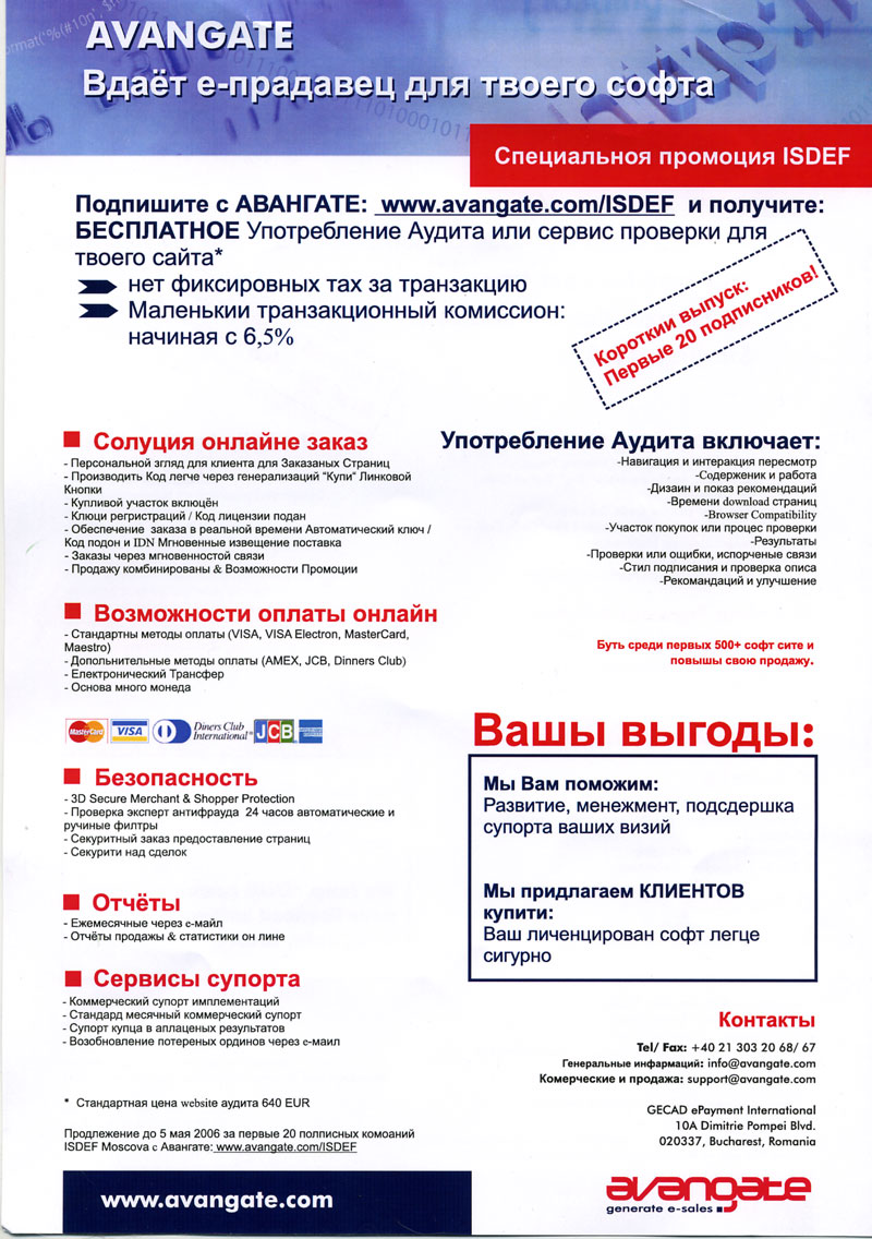 На нынешнем ISDEF'е с раздаточными материалами было как-то кисло. Вот раньше, в старое время, раздавали кучу всякой мануфактуры, софтовые и железячные журналы, программы и учебники (в основном, кстати, мои). Однако вчера выдали только журнал PC Magazine и рекламную листовку фирмы Avangate. Английская часть листовки особого интереса не представляла, но фирма любезно перевела листовку на русский, и вот это был уже полный отвал башки! Замечу, что эту листовку раздали всем присутствующим - вероятно, чтобы доставить им особое удовольствие!