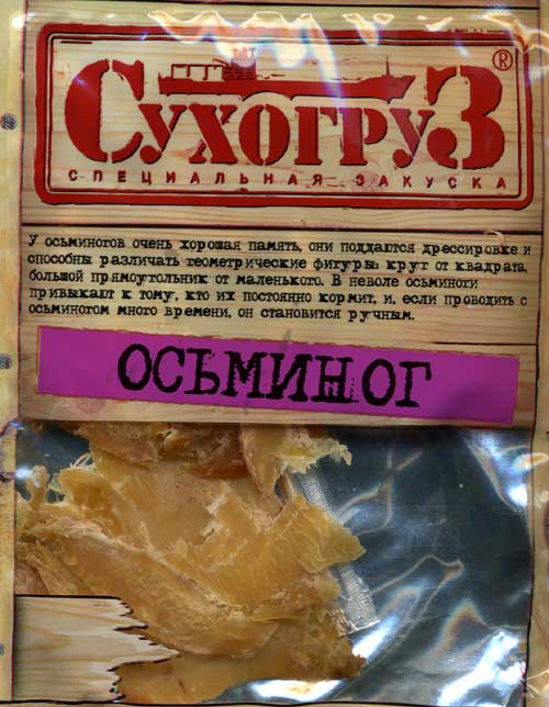 Хохма в том, что этот текст размещен вовсе не в зоомагазине, где продаются живые осьминожки. Он размещен на пакетиках с высушенными трупиками осьминогов. Юморные ребята работают в этом "Сухогрузе". Хотя сам продукт - мерзкий до невозможности, сплошная химия. Есть это невозможно. Но зато можно узнать много нового об осьминогах.