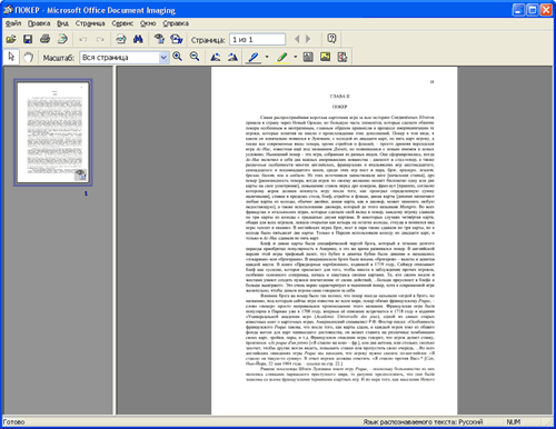 Вы знаете, что в MS Office есть распознавалка, причем вполне неплохая? Я не знал. Спасибо ne0d1n, который просветил. Программа называется Microsoft Office Document Imaging и находится в папке "Средства Microsoft Office". (Если компонент не установлен, то Office при первом запуске программы попросит дистрибутивный диск, чтобы его установить.)