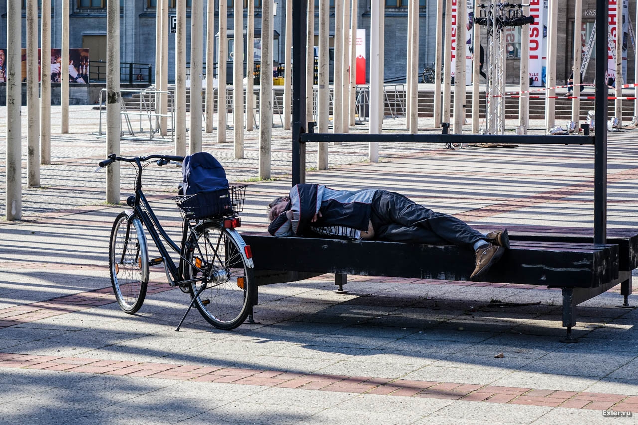 Вот какой-то вольный путешественник ждет открытия выставки. Трогательная картина. Наверное, именно такие будут ночевать у магазинов Apple перед началом продаж 6 айфона.