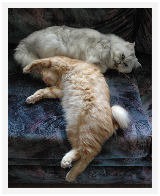 Потом я стал призывать стадо бешеных зверей (Анфису и Тошу), чтобы они своим кровожадным видом и требовательными взмякиваниями довели карасиков до сердечного приступа... Тоже не прошло! Потому что карасики на зверей не обращали ни малейшего внимания, зато попробуйте что-нибудь сделать на кухне, когда там с криками и воплями носится зверье, готовое прищучить этих карасиков в любом их состоянии и даже без сковородки.