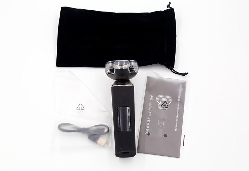 Комплектакция: бритва с пластиковой защитной насадкой, кабель USB - Type-C, мягкий чехол для бритвы из черной бархатной ткани, инструкция на китайском, двойная щетка для очистки, которую я поленился достать из чехла, но вы наверняка нарисуете ее в своем богатом воображении. Замечу, что адаптер для зарядки здесь не приложили - я уверен, что это сделали в чисто экологических целях, и данную бритву подобное гуманистическое действо роднит с компанией Apple.