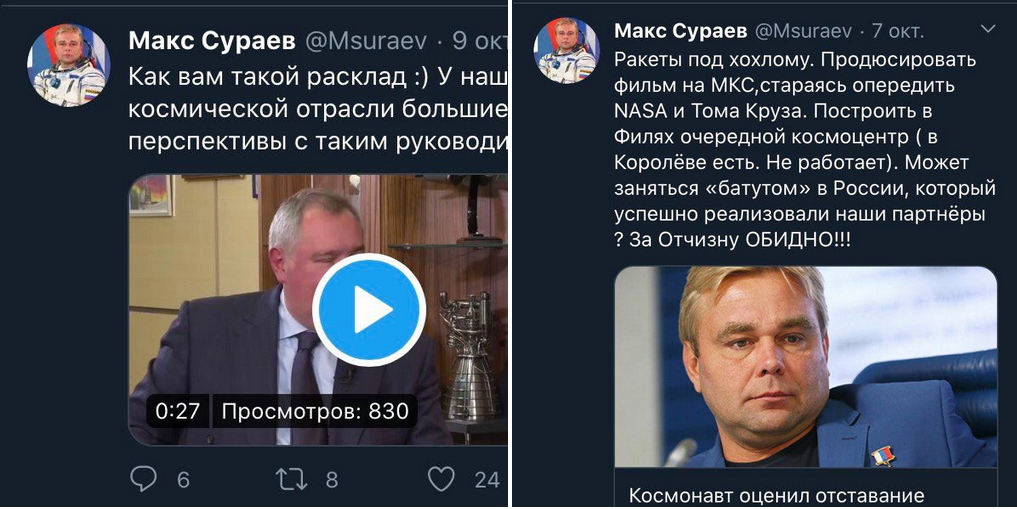 Замечу, что нынешний бардак сильно достал большинство космонавтов в отряде, но они, как люди служивые, пока сдерживаются, некоторые - из последних сил. Но как только космонавт покидает отряд, он становится более свободен в высказываниях. Можно привести пример Федора Юрчихина, 8 июня опубликовавшего свою статью в "Коммерсанте" "Прошлым можно гордиться, но им нельзя жить". После этой критической статьи пять раз слетавший в космос Юрчихин был вынужден покинуть свою административную должность из-за давления со стороны Рогозина, но Сураев, будучи депутатом от "Единой России", решил, что его Рогозин не достанет. Поэтому и появились его твиты, вызвавшие в руководстве Роскосмоса эффект разорвавшейся бомбы. Сначала даже прошла информация о том, что "твиттер Сураева взломали", однако Максим подтвердил своим знакомым, что это именно его посты.