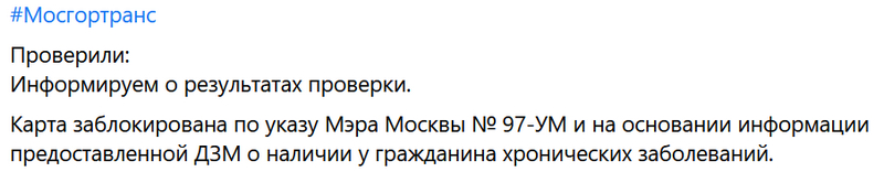Карта заблокирована по указу Мэра Москвы № 97-УМ и на основании информации предоставленной ДЗМ о наличии у гражданина хронических заболеваний.