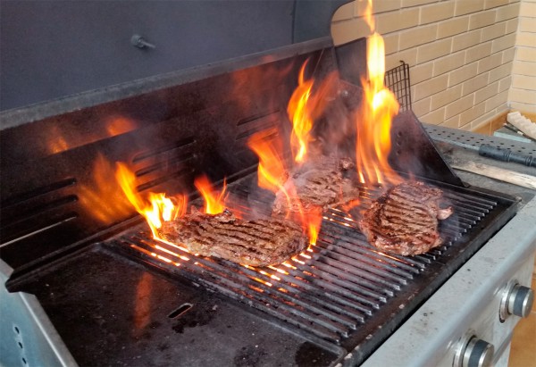 Раскаляем девайс до достижения максимальной температуры жарочной поверхности и кидаем туда наш стейк (кстати, он должен быть сухим снаружи, можно промокнуть салфеткой). Если используется сковорода или электрогриль, то можно перевернуть один раз, если же жарка идет на угле или газе, то крутить мясо придется чаще, так как капающий жир горит и есть опасность, что мясо в свою очередь подгорит.
