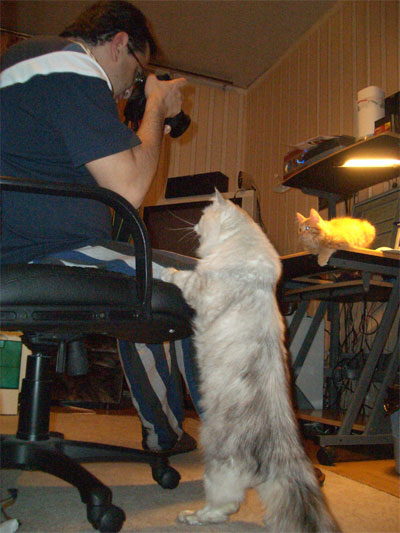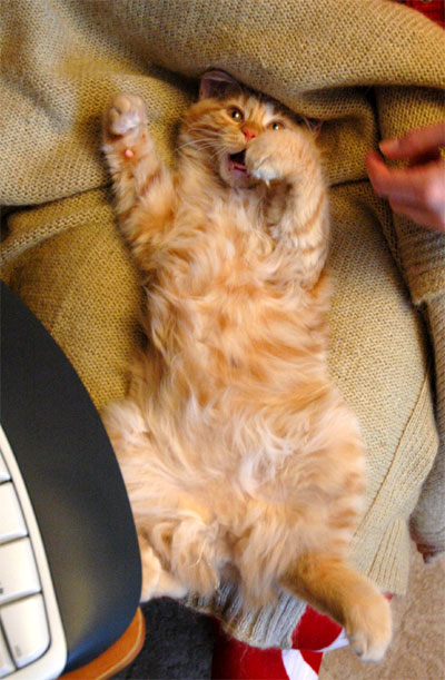 Кстати, Анфисик вовсе не грустная. У нее просто от вспышки такой обалдевший вид. Сегодня Анфиса поняла, что мое кресло ей нужно значительно больше, чем мне. Но мы договорились. Я аккуратно сижу на краешке, работаю за компьютером, а Анфиса вольготно валяется за моей спиной. И дразнит кота Тошу, которому такие вольности никогда не дозволялись...