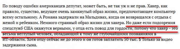 В "Собеседнике" журналисты нередко пишут заметки, не приходя в сознание. Вот как, например, некая Гужева Надежда. Цитирую заметку о задержанном американцами сыне депутата Селезнева. Этого Романа Селезнева подозревают в кардерстве: хищении информации о банковских картах четверти миллиона американцев.