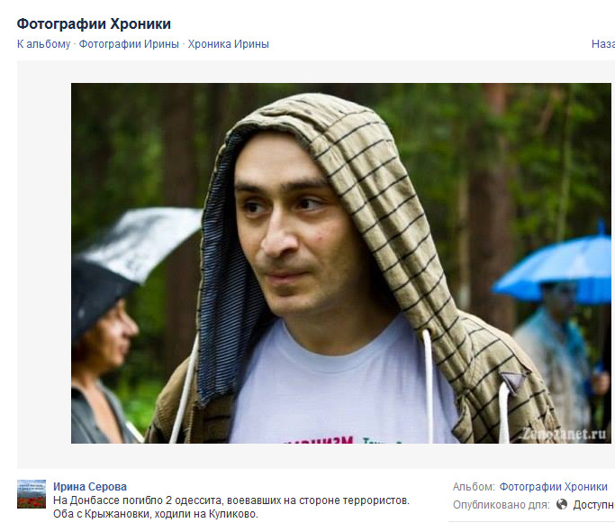 В FB дамочка зажгла. Леня Каганов у нас теперь стал мертвым одесским террористом. Причем на пикнике и двухлетней давности. Он с Крыжановки. Ходил на Куликово. Документальное свидетельство, my ass.