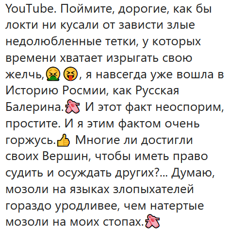 Ну и, конечно же, гордая Настя ответила всем своим недоброжелателям, потому что Русская Балерина - она не сдается (кроме как напрокат), и на любые происки ответит шпагатом, который навсегда вошел в Красу и Гордость Росмии (что за страна такая - не знаю, но, наверное, такая же гордая, как и Настя)!