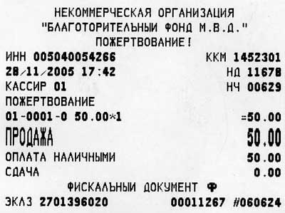 Раньше, насколько я помню, въезд на машине на Савеловский компьютерный рынок был бесплатный. Вчера заехал туда после длительного перерыва - а там нововведение! Деньги за въезд берут. Но очень хитро. То есть формально-то денег не берут. Просто стоит шлагбаум, перед ним будка, а на ней надпись "Благотворительный фонд МВД". Ты не платишь за въезд на территорию рынка, а просто делаешь пожертвование. Совершенно добровольно. Но отказаться, разумеется, не можешь, потому что задом выехать из этого узенького проезда нельзя, сзади уже стоят машины, а шлагбаум не откроют, пока ты добровольно не пожертвуешь. Но все честно, выдают чек. Вот такой: