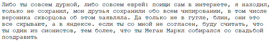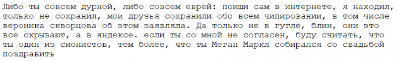 Мне прям даже интересно: как Паша сумел догадаться, что я не дурной, а совсем еврей? Такая смелая догадка как-то не для уровня его мозгов. И его друзья сохранили обо всем чипировании, в том числе веронику скворцову. Тут главное - не в гугле, блин, там одни евреи.
