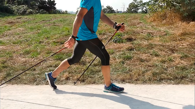 Роликов, в которых демонстрируется правильная техника, полно: там главное - руки должны быть совершенно прямые, в локтях не сгибаются, при отводе назад палка "бросается", то есть рукой не удерживается, висит на темляке, а когда опираешься на палку, то ручку при этом не обхватываешь, а просто касаешься, потому что усилие передается через темляк.