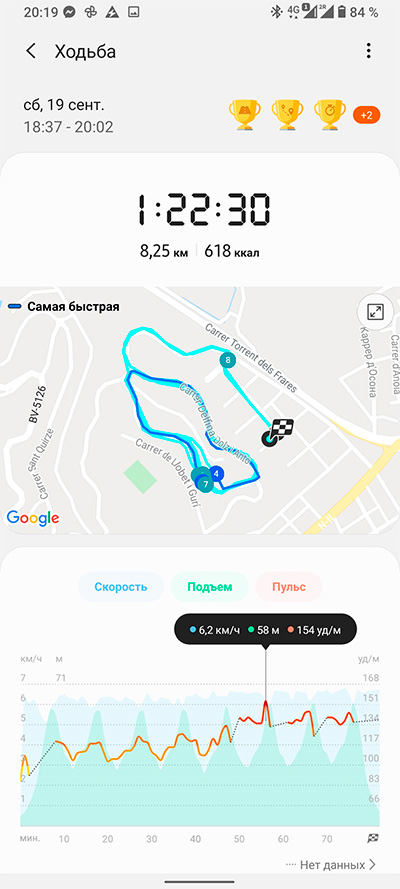 Вот, например, субботняя прогулка - и пульс уже приличный, и скорость неплохая (в самом начале там идет довольно большой подъем на холм). Классная штука, короче говоря, очень доволен - вот прям то что нужно!