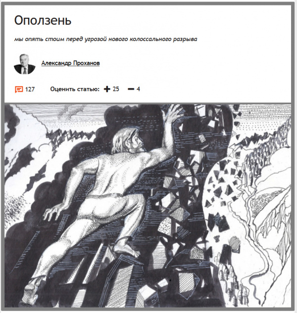 Вы, конечно, будете смеяться, но беспокойный старик Проханов прозрел: полностью разочаровался в великом Путине Таврическом, и очаровался Навальным, который раскрыл глаза патриотам России на чудовищную коррупцию и стяжательство людей во власти.