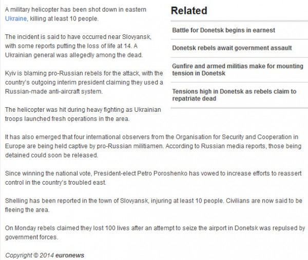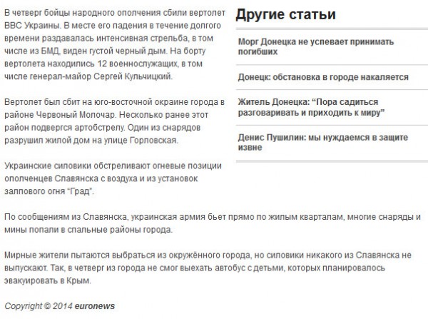 Сухая информация: повстанцы сбили украинский вертолет, украинские силовики обстреливают позиции ополченцев из "Града", бьют по жилым кварталам. Из города украинские силовики никого не выпускают.