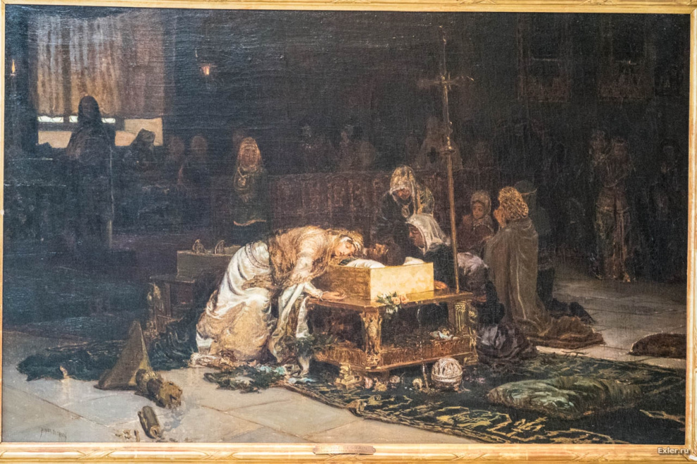 Вторая картина исполнена уже в более традиционной манере: оно изображает Исабель, дарящую последний поцелуй своему Диего. На заднем плане мы видим фигуру безутешной Елены, которая даже не смеет подойти к гробу того, кого она любила всю жизнь. А безутешного Фернандо де Гамбоа на картине и не изобразили - в этом мире нет справедливости.