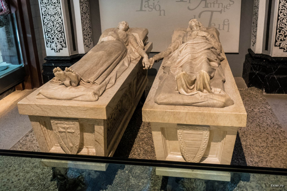 А вот саркофаги безутешных влюбленных. В них действительно хранятся останки Диего и Исабель (там сбоку проделаны дырочки и посетители могут видеть останки). На верхних крышках саркофагов располагаются скульптуры влюбленных, которые пытаются соприкоснуться руками, но между ладонями остается несколько миллиметров - в знак того, что им так и не суждено соединиться.