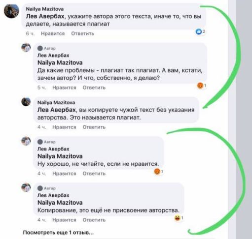 Зашел по ссылке, посмотрел. Ну да, Авербах просто тупо скопировал статью Елены и выложил ее в своем Facebook без каких-либо упоминаний о том, что это вообще не его статья. Подписчики это все принимают за чистую монету и пишут что-то вроде "Лев, как же вы правильно все написали", "Очень здорово написано, спасибо", "Вы прям умница" и все такое. И этот Авербах спокойно принимает все эти восторги, даже и не пикнув по поводу того, что он это просто тупо своровал. Это именно воровство, по-другому такие вещи никак не называются.