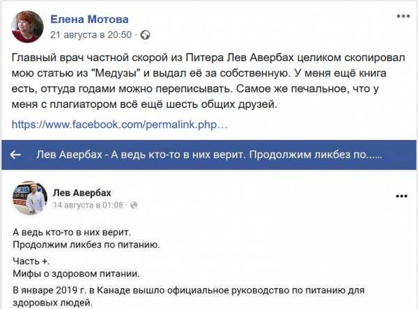 Подписчики Елены порылись у него в Facebook и выяснили, что там полно таких случаев. Солидный доктор Авербах нагло ворует статьи самых различных людей и публикует у себя в Facebook как свои собственные. Причем считает это совершенно нормальным. У него там в комментариях куча людей спрашивают, с какой стати он чужие статьи выдает за свои, и на это Авербах или не отвечает, или начинает очень тупо хамить в ответ.