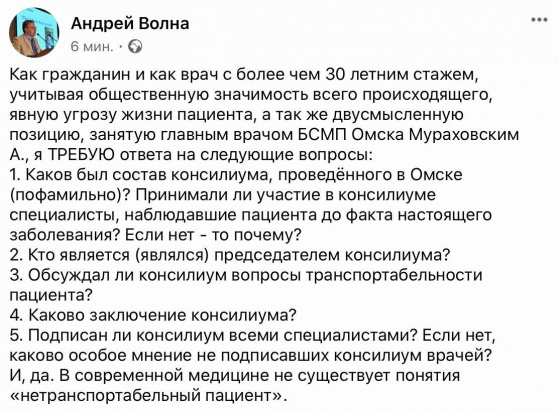 Это при том, что самолет из Берлина, оборудованный всем необходимым для перевозки пациента в тяжелом состоянии, уже прибыл в Омск. И родные Алексея требуют, чтобы Навального отправили в Германию. И при том, что Песков заявлял, что Кремль окажет всяческое содействие в обеспечении вывоза политика на лечение за границу. Вот и оказали. Очевидно, что главврачу омской больницы выдали совершенно недвусмысленные инструкции пациента не отдавать.