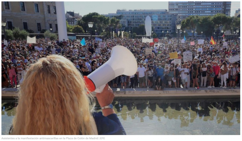 В воскресенье в Мадриде более тысячи человек (по другим данным - порядка 2500 человек) собрались на демонстрацию на центральной площади Пласа-де-Колон, чтобы выразить свой протест против навязываемых правительством "средств безопасности" - прежде всего, против требования повсеместно носить маски. Протестующие считают эти меры не только избыточными, но и откровенно вредными, так как маски не позволяют нормально дышать.